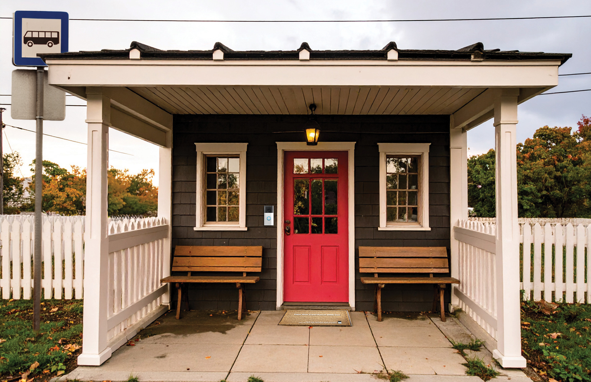 Bus stop turned into someone’s front porch: benches are turned into porch seating, fencing is painted on the side glass, there is a front door, windows on either side, and a doormat in front with a porch light above it. To the left of the door there is a Ring Video Doorbell. On the doormat there is copy, “Take your front porch with you. Check your front door from anywhere using the Ring Video Doorbell’s built in camera.”