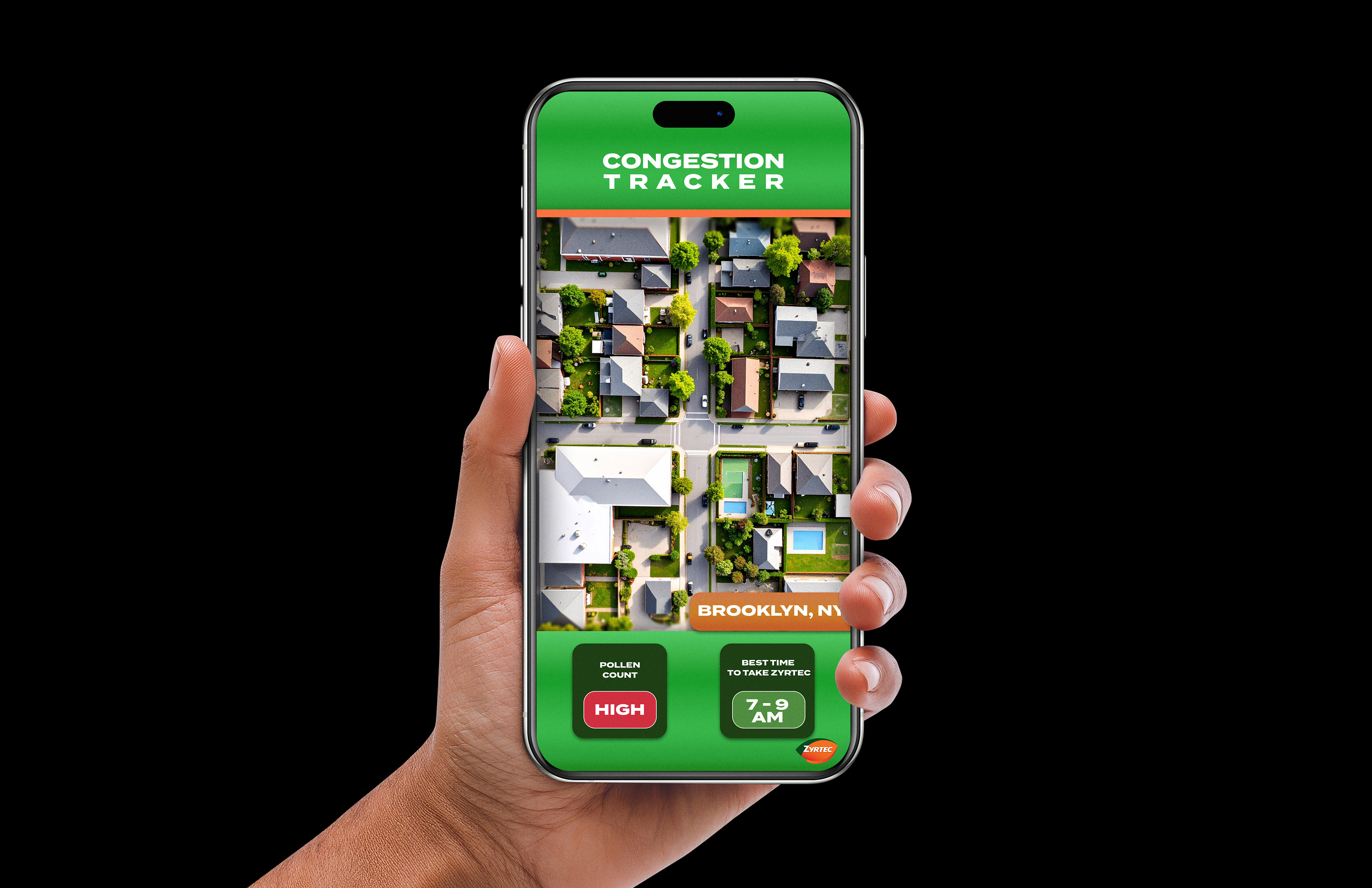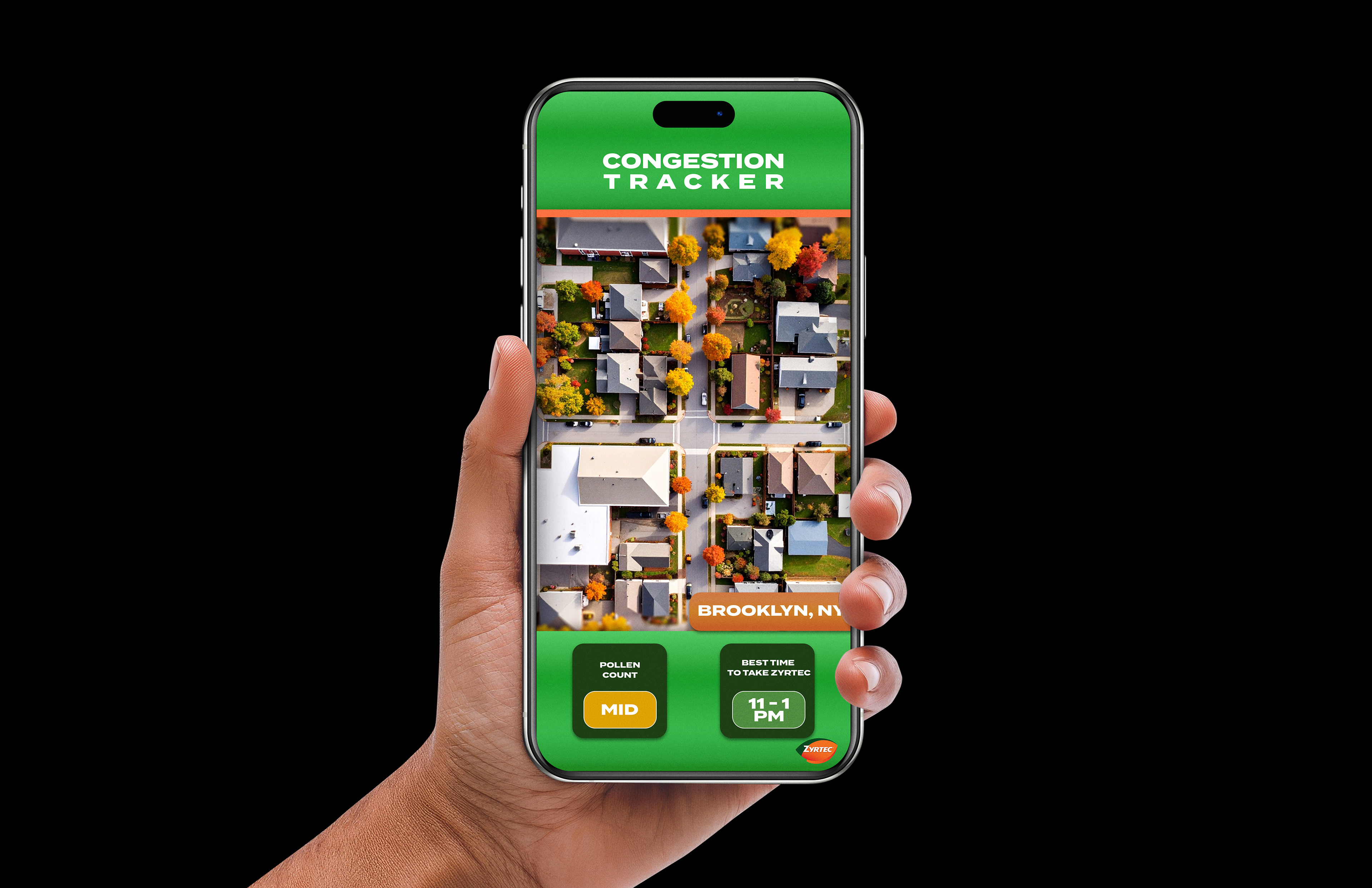 The Congestion Tracker App shows a map based on the user’s current location. It shows the current pollen count in the user’s area and the optimal time to take Zyrtec to best combat allergies and allergy symptoms. Shown are the same user location in three separate times of year, Spring, Fall, and Winter.